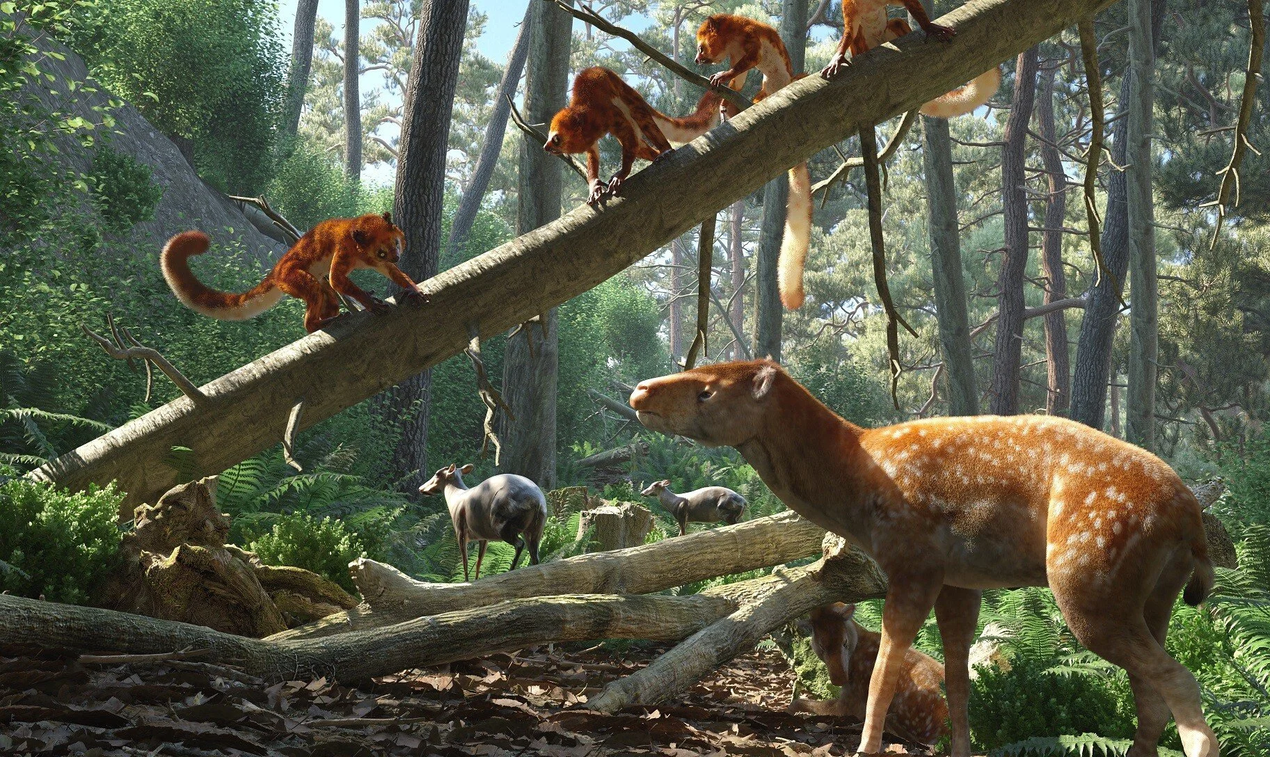 Ricostruzione di una scena dall’Eocene della Svizzera con alcuni esemplari di uno dei primi rappresentanti degli Strepsirhini, Adapis, e l’ungulato Palaeotherium in primo piano. FONTE: © Fabio Manucci